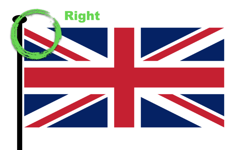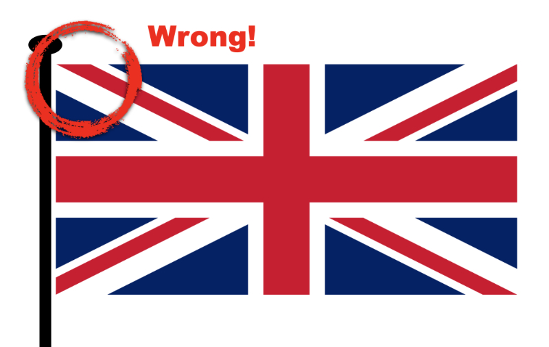 I remember chatting to an Australian many years ago and told him that the best way to irritate a “Brit” is to fly the flag upside down. He laughed – he didn’t know the flag had an up and a down. Sadly, many pictures in the press indicate that a lot of British people don’t know there’s a right way (and wrong way) either. Our flag does not have reflective symmetry. This is due to the offset of the St Patrick’s and St Andrew’s crosses. What this means is that there is an up and a down. The wide white of the St. Andrew’s cross should be above the red of the St. Patrick’s cross on the part of the flag that attaches to the pole, as shown here…